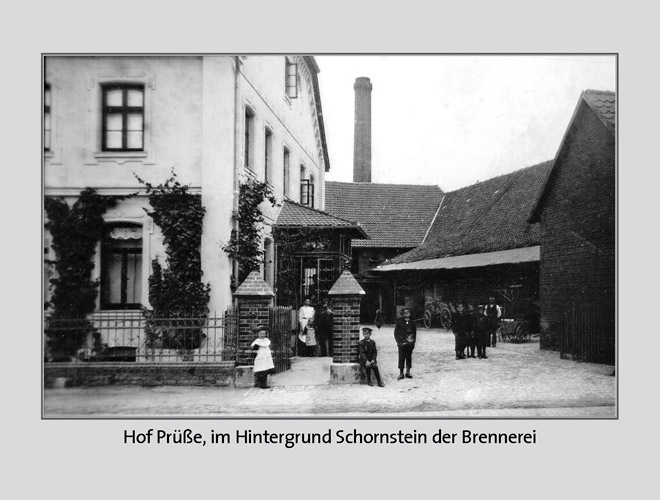 Das Foto entstand etwa im Jahre 1915. Der Schornstein, der im Hintergrund steht, gehört zur Brennerei, die sich auf dem Hof befand. Die Besitzer des Hofes besaßen in der Zeit von 1810 bis 1909 das Recht, aus Getreide Schnaps zu brennen. Dieser wurde auf dem Hof in Flaschen abgefüllt, ausgefahren und an Händler und Gastwirte verkauft. In guten Jahren waren das schon mal über 1.000 Liter. In dieser Zeit waren durchschnittlich 12 Personen auf dem Hof beschäftigt. Sie bewirtschafteten die Felder, halfen bei der Ernte, kümmerten sich um das Vieh und arbeiteten auch in der Brennerei. Der Schornstein wurde bereits kurz nach Ablauf der Brennrechte abgerissen. Die Brennerei musste in den Jahren 1967/68 einer moderne Maschinenhalle weichen.